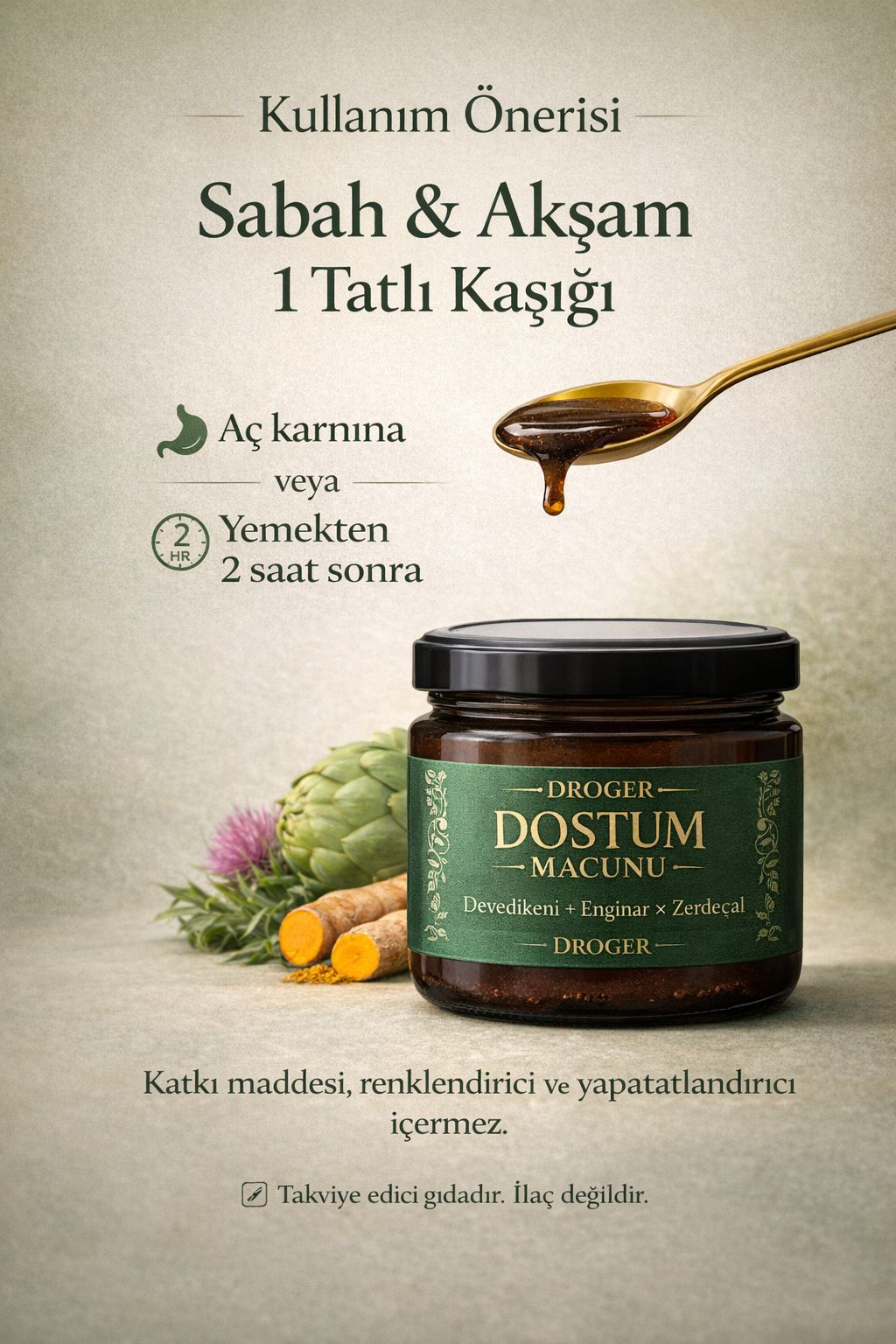 Droger Dostum Macunu, karaciğer sağlığını destekleyen, bağışıklık sisteminizi güçlendiren ve vücudunuzun doğal dengeye kavuşmasına yardımcı olan özel bir üründür. 🌱🍯